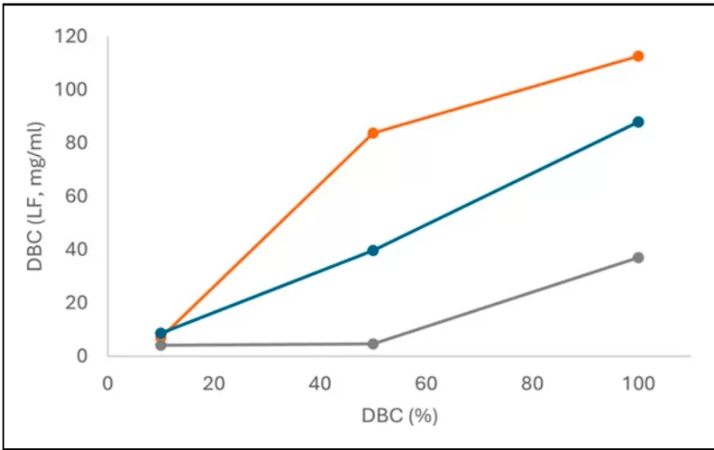 Fig. 3. Comparison of three chromatography media for lactoferrin DBC at Q10, Q50, and Q100. SP Seplife 6AG XL 200 (orange), Seplife SP5504C (blue), and SP Sepharose Big Beads (gray). Standard commercial purified bLF was used for the test in a 5 mL column (0.8 · 10 cm) with 20 mM phosphate buffer, pH 6.7 mobile phase, 2 minutes contact time for the sample application and elution using 20 mM phosphate buffer with 1 M NaCl, pH 6.7. bLF, bovine lactoferrin; DBC, dynamic binding capacity.