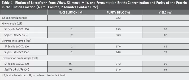 The agarose-based SP Seplife® 6AG XL 200 demonstrated excellent performance for dairy-derived lactoferrin. Its hydrophilic matrix reduced undesired interactions with milk proteins and other components, resulting in: