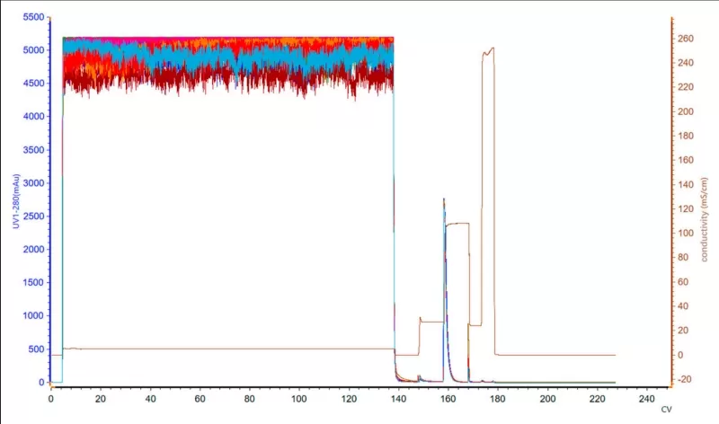 Fig. 4. Overlay of the cycles 1,10, 20, 30, 40, 50, 60, 70, and 80 chromatograms obtained by passing 130 CV skimmed milk containing 0.3 mg/L bLF through a 1.6 · 20 cm (CV = 40 mL) column packed with SP Seplife 6AG XL 200 at 2 minutes contact time. Impurities were eluted with 0.24 M NaCl, bLF was eluted with 1 M NaCl. bLF, bovine lactoferrin.