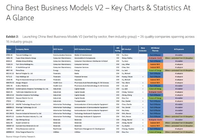 Morgan Stanley’s “China Best Business Models 2.0” is not a simple ranking based on market capitalization or short-term financial performance. Instead, it identifies companies with sustainable competitive advantages and strong economic moats through a comprehensive evaluation framework.